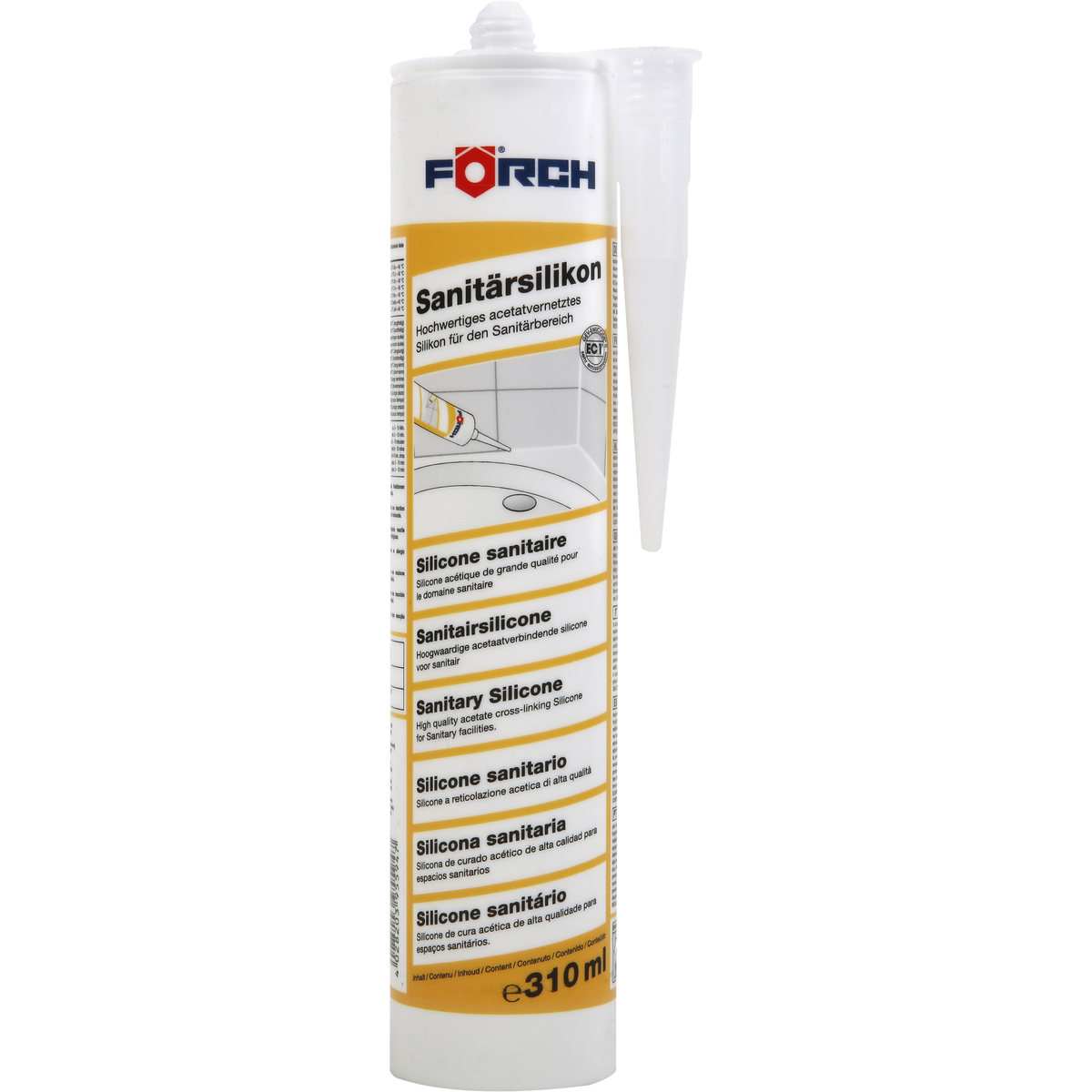 Der Förch Sanitärsilikon-Dichtstoff ist ein hochwertiger, acetatvernetzender und zinnfreier Silikondichtstoff mit ausgezeichneter Haftung auf bauüblichen Untergründen. Er eignet sich besonders für den Einsatz in Sanitär-, Nass- und Küchenbereichen.