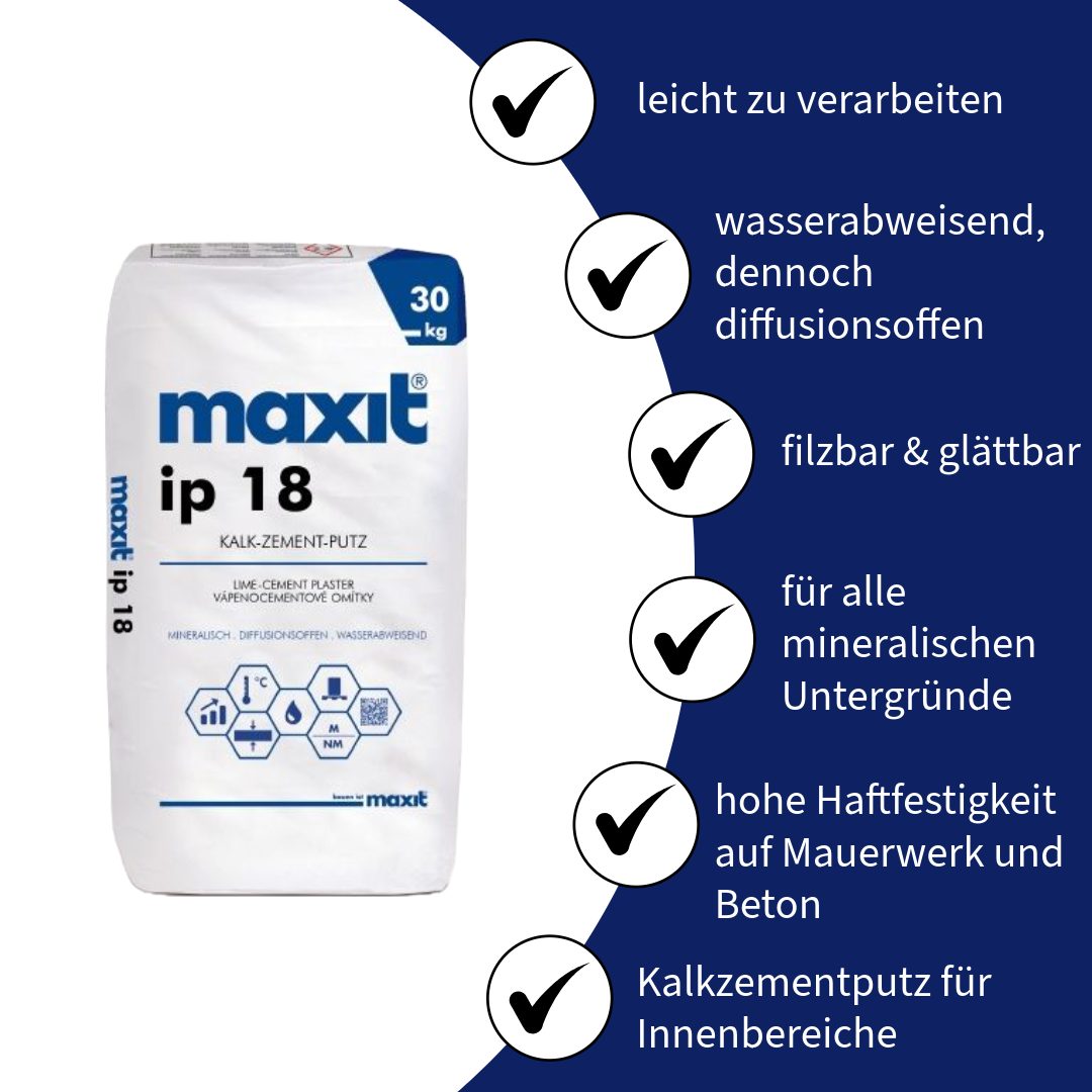 maxit ip 18 Kalk-Zement-Putz 30kg für den Außen- und Innenbereich, leicht zu verarbeiten, filz- und streichbar